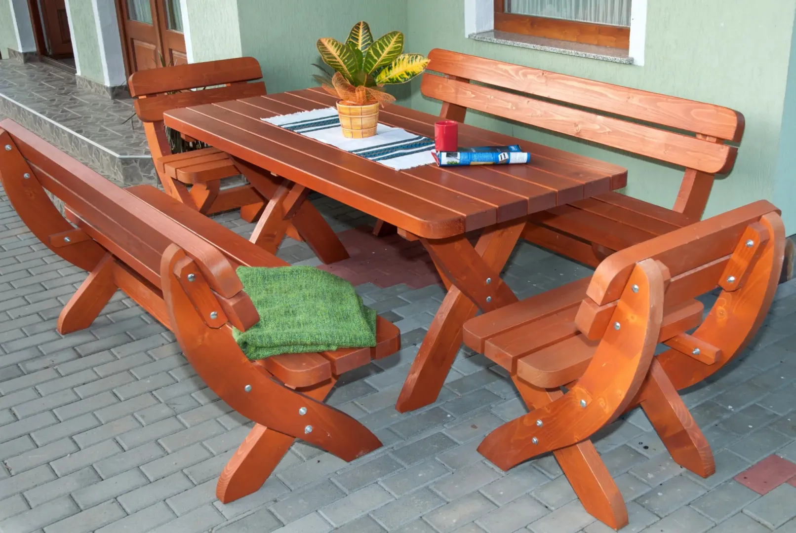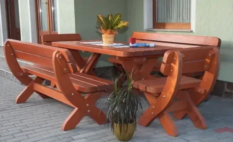 Das Holz ist mit einem Tauchverfahren (Imprägnierung) behandelt und verfügt über eine witterungsbeständige Oberfläche, die das Material zuverlässig vor äußeren Einflüssen schützt. Die Garnitur ist in der auf dem ersten Produktfoto dargestellten Farbe erhältlich.